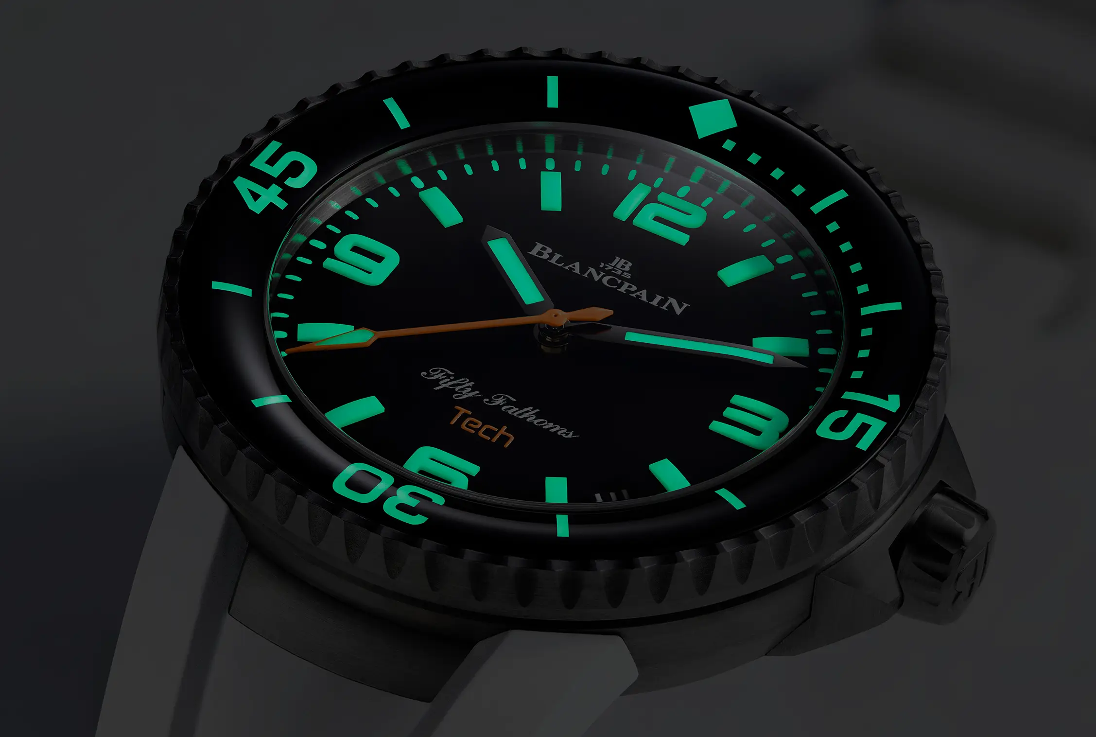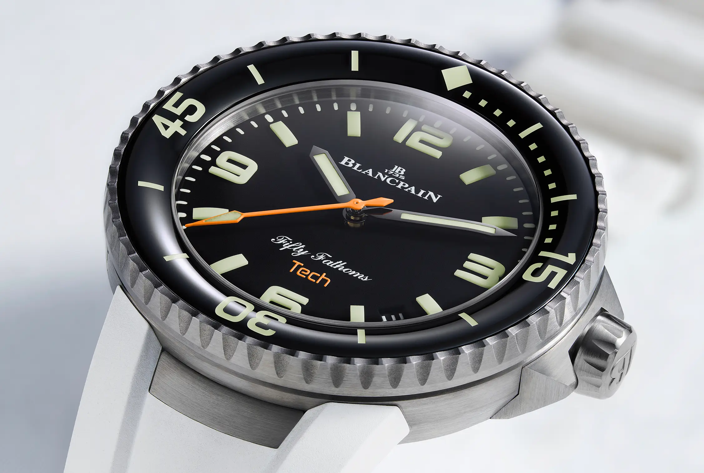 La versión Tech representa la evolución más vanguardista de esta saga marina. Concebido como un reloj herramienta con especificaciones de élite, el Fifty Fathoms Tech se construye en titanio grado 23, un material conocido por su resistencia, ligereza y biocompatibilidad. Su caja de 45 mm aloja una válvula de escape de helio, resistencia al agua hasta 300 metros, y un bisel cerámico unidireccional de 120 clics, ideal para ser manipulado con guantes de buceo.