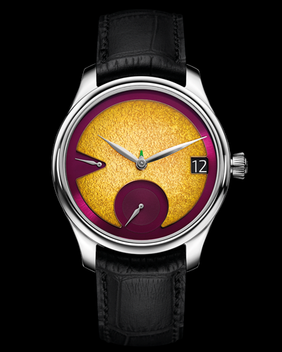- Carátula: Lacada Purple y con esmalte «Grand Feu» Maracuyá fumé. Segunda esfera: esmalte «Grand Feu» Maracuja fumé con textura amartillada, base de oro amarillo de 18 quilates, bordes pulidos y bañados en rodio. Manecillas en forma de hoja. Pequeña manecilla central con forma de flecha para la indicación de los meses con un toque de lacado en verde. Indicador de fecha grande. Pequeña subesfera lacada para el segundero de patrón circular.