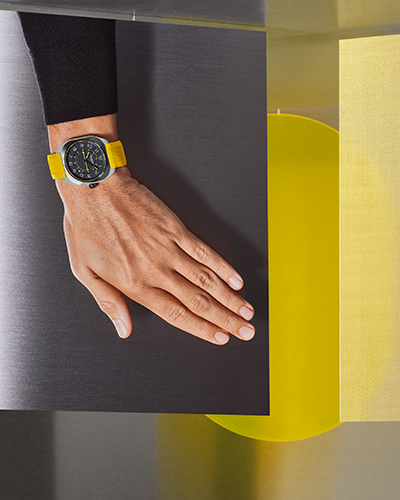 - Correa: Caucho amarillo con cierre desplegable de titanio recubierto con DLC negro cepillado satinado, 21 mm.