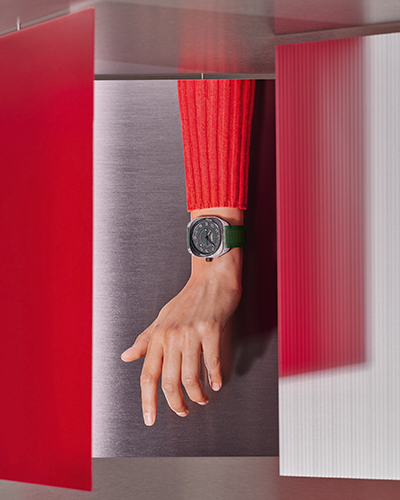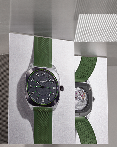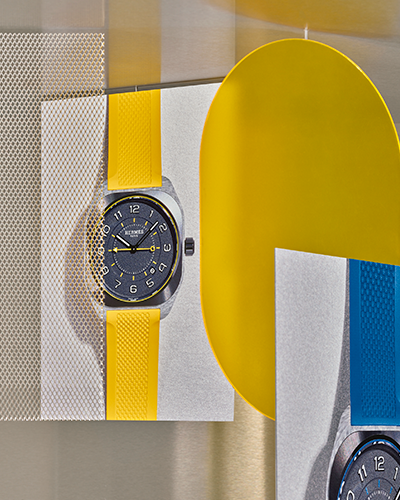 Los toques de amarillo, verde, azul o naranja en el sello del reloj, la escala de los minutos y el segundero barnizado acentúan la claridad de esta pantalla, impulsada por un movimiento mecánico automático Manufactura Hermès H1837. Asegurada por un cierre desplegable de titanio tratado con DLC negro, una correa de caucho con un efecto «tejido» estructurado combina con los colores de cada modelo.