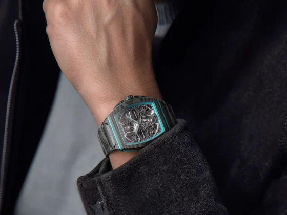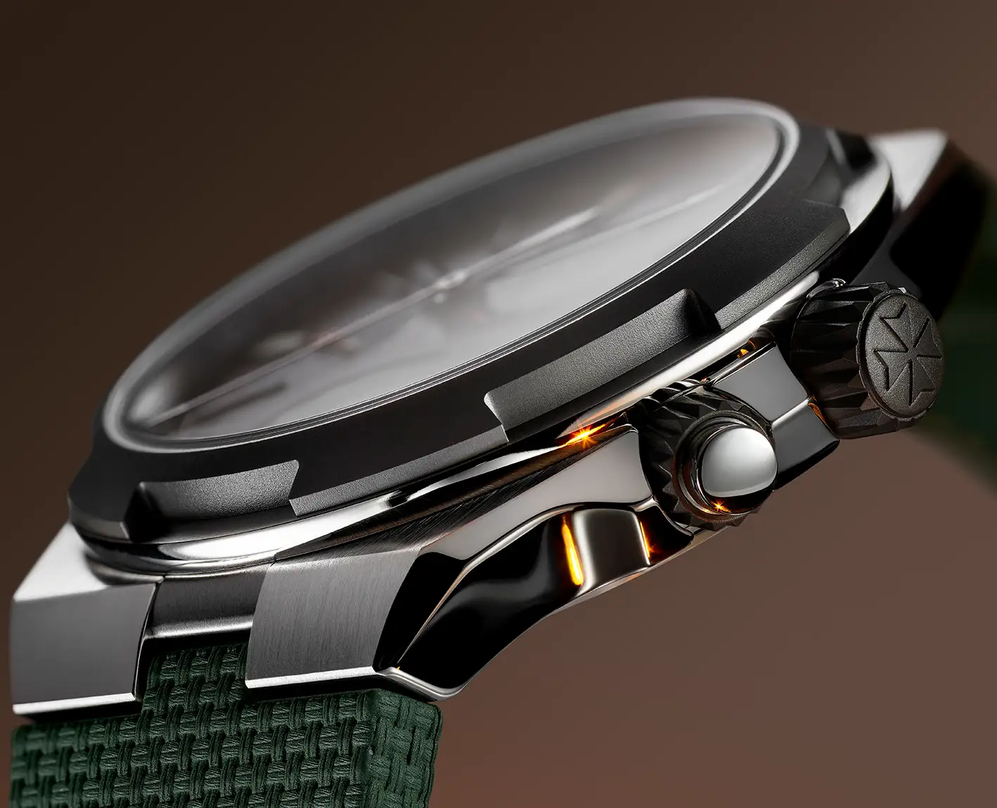 El titanio, además, permite un juego de contrastes especialmente interesante. El bisel hexagonal (inspirado en la cruz de Malta, símbolo de la Maison) adopta un acabado gris antracita mate que se extiende también a la corona y al anillo de los pulsadores ¡Vaya carácter que adopta!