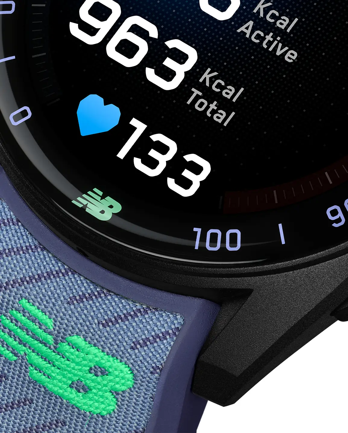 La carátula cuenta con una escala de 0 a 100 recientemente desarrollada que se sincroniza con las métricas de entrenamiento basadas en aplicaciones, lo que brinda a los corredores información clara e inmediata sobre su esfuerzo. Un logotipo de New Balance grabado en el fondo de la caja completa el diseño con un sutil guiño al enfoque compartido de ambas marcas en la precisión y la excelencia atlética.